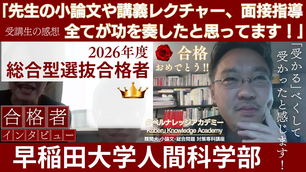 「私は」から書き始める小論文答案からの脱却は、この事例を参照願います。オンライン講義で「論文と作文の違い」についてわかりやすくレクチャーしたうえで(オンライン講義スライド抜粋)、オーダーメイドの個別指導を行うことで答案の質が圧倒的に向上し、この受講生は志望校に見事合格を果たしました(小論文の質が向上した当校受講生の事例)。